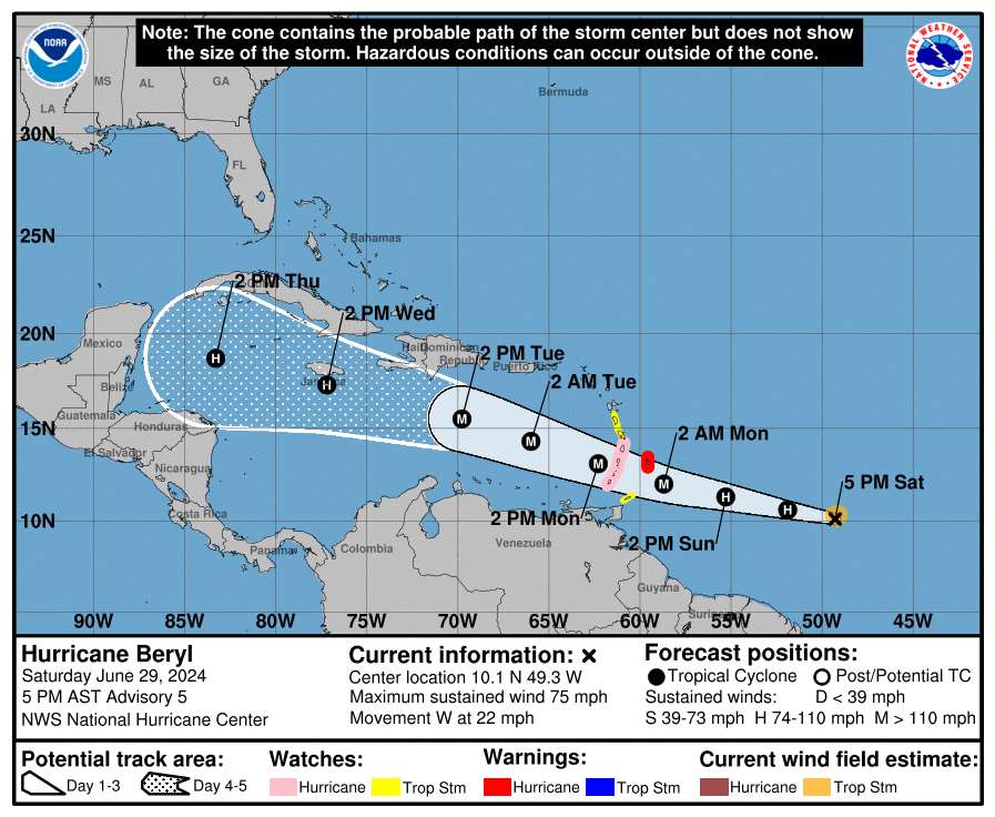 The National Hurricane Center has noted that tropical cyclone Beryl has intensified into a category one hurricane. The system is expected to strengthen into a major hurricane as it moves across portions of the southern Lesser Antilles on Sunday night and Monday.