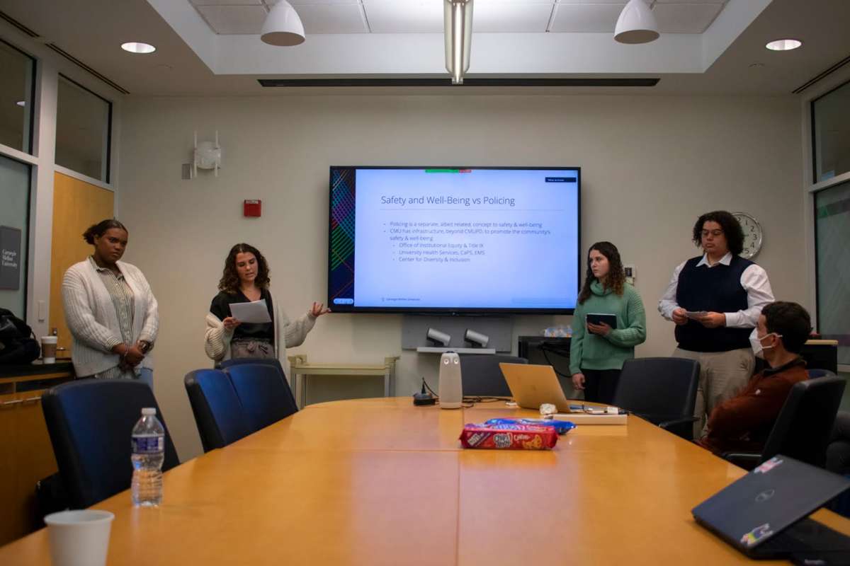 (From left to right) Ananiah Pettis, Isabel Brum, Emilia Schwallie and Alastair McMillan present their capstone about policing on CMU's campus on Friday, Dec. 9, 2022. A group of seniors spent months researching campus policing and outlined nine recommendations for improvement in a presentation on Friday. by Emma Folts, PublicSource A group of seniors at … Continued