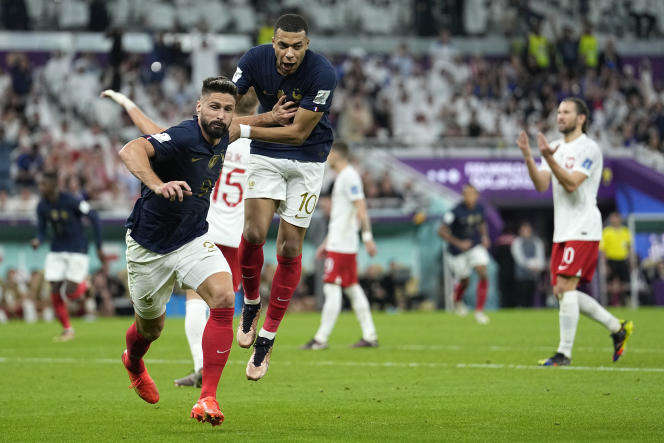 Olivier Giroud célèbre son premier but avec Kylian Mbappé lors de la victoire 3-1 de l’équipe de France face à la Pologne, à Doha, le 4 décembre 2022. EBRAHIM NOROOZI / AP Depuis le début de cette Coupe du monde au Qatar, Kylian Mbappé c’était un peu Bernardo avec un masque de Zorro dans le