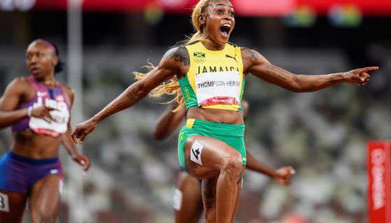 The Jamaica-bred runner broke one of Florence Griffith Joyner's records as Jamaica swept the women's 100 meter race.