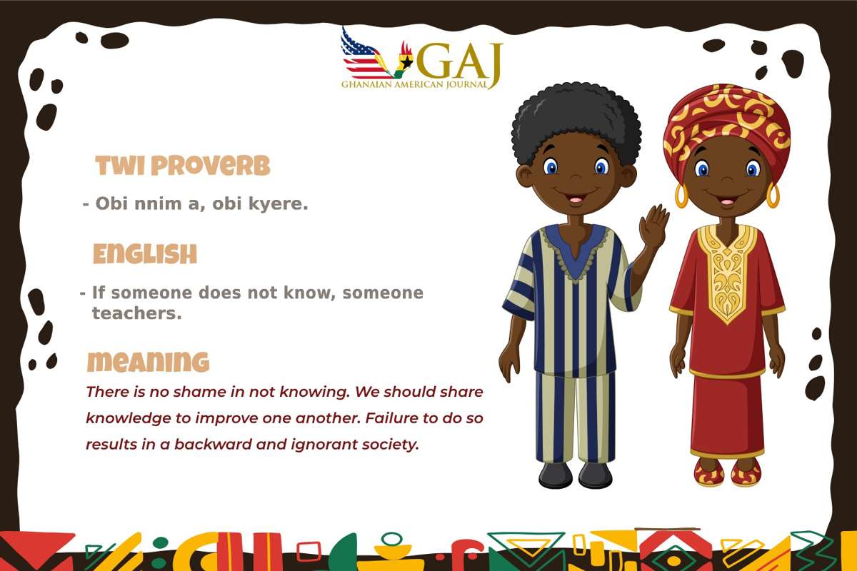 Twi Proverb: Obi nnim a, obi kyere English: If someone does not know, someone teaches.